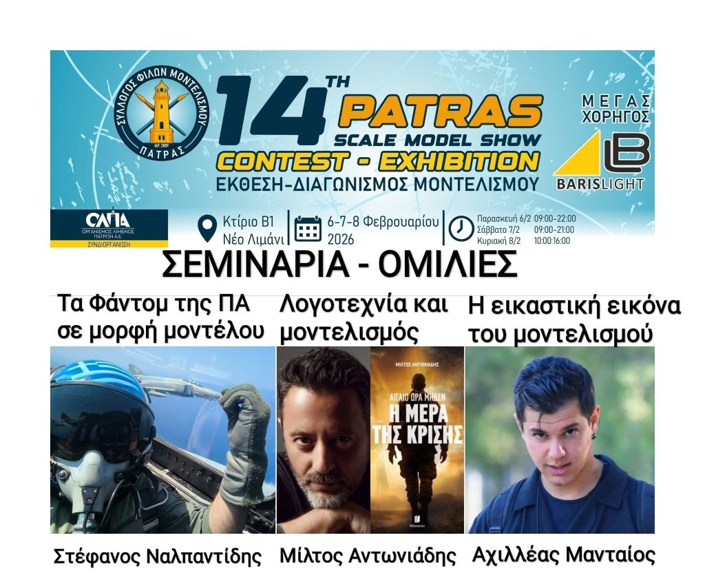 6-7 και 8 Φεβρουαρίου 2026 ο Σύλλογος Φίλων Μοντελισμού Πάτρας διοργανώνει την 14η Έκθεση – Διαγωνισμό.